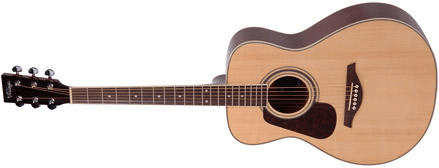 VINTAGE LH-V300 - левосторонняя версия гитары VINTAGE V-300. Верхняя дека изготовлена из цельной ели, нижняя дека и обечайки: дерево "нато". Гриф: дерево "нато" с палисандровой накладкой. Бридж: палисандр. Механика: хромированная. Цвет: натуральный.