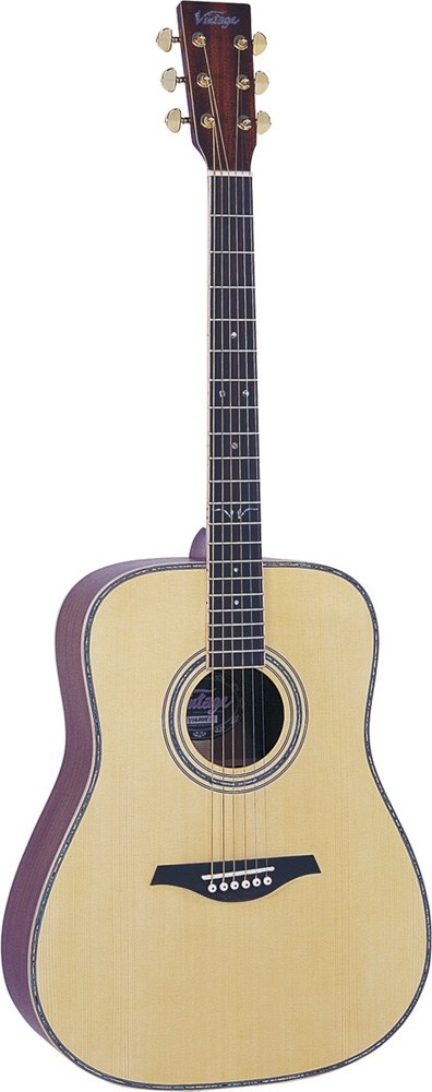 VINTAGE V-1400N Акустическая вестерн гитара. Верхняя дека: цельная ель. Нижняя дека и обечайки: махогани. Гриф: махогани с палисандровой накладкой. Бридж: палисандр. Позолоченная механика Grover® 102G. Цвет: натуральный.