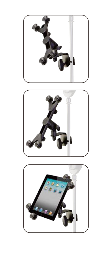 Держатель для планшета типа iPad и подобных (7"-14"), крепится на микрофонную стойку, фиксация планшета на угловых кронштейнах, металлическая конструкция.