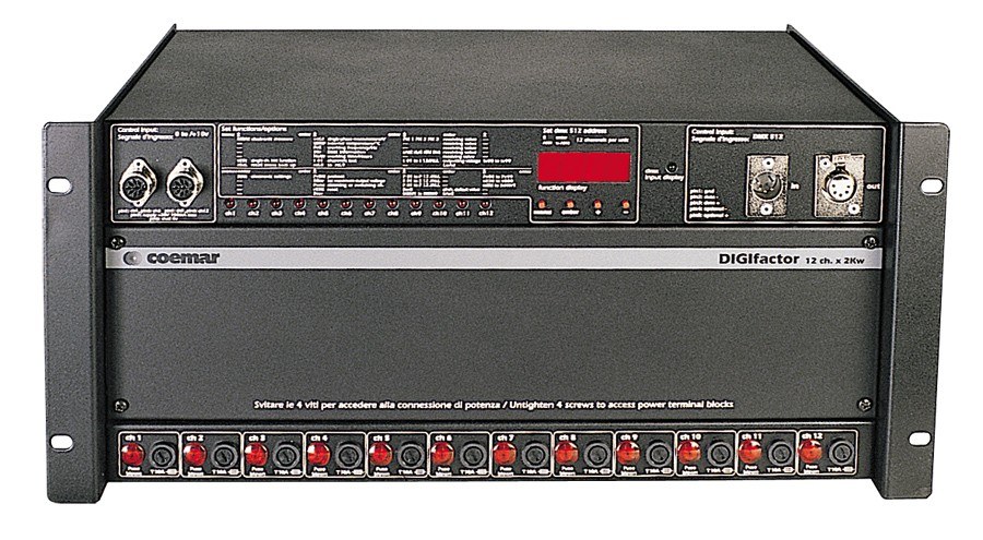 DMX-управляемый ДИММЕР для всех типов электрической нагрузки DIGIfactor 12. 12 каналов, 2 кВт/канал, индивидуальная защита каждого канала, LED-индикатор статуса каналов. Автоматическое понижение тока при перегреве. Характеристики Coemar DIGIfactor 12: 12 диммерных каналов по 2,3 Kw (10 A) каждый. Цифровые сигналы активируются посредством стандартного протокола DMX 512 через разъемы XLR 5 (Male/Female). Аналоговые сигналы активируются посредством 0/+10 V DC через разъемы Locking Din F. Каждый канал защищен керамическим предохранителем. При перегорании предохранителя пользователь оповещается светодиоидной индикацией на рабочей панели. Состояние каждого канала отмечается светодиоидными индикаторами. Мультифункциональный дисплей. Измерения: напряжение на каждой фазе, частота, внутренняя температура, параметры DMX 512. Подключение питания и выхода мощности с помощью внутренних клемм. Генератор питания +20 DC. Питание 200/380 трифазы, подключение звездой или треугольником 50/60 Hz, регуляция автоматическая. 9 программируемых сцен с плавной сменой. Тест на каждом канале. Специальные конфигурации: выбор на каждом канале switching/dimming, цифровой предварительный разогрев с различной модальностью. Технические характеристики: Протокол связи DMX 512 стандарт, 0-10 Vdc Выходная мощность 12 Ch x 2,3 Kw, 10 A Энергопотребление 200/240 V 50-60 Hz Размер, мм 488x322x220 Вес, кг 20 Управляющий протокол DMX 512, 0-10 В Выходное напряжение 12 каналов по 2,3 кВт, 10 A Пользовательский интерфейс светодиодный дисплей для настройки функций Напряжение питания 200/240 В, 50/60 Гц Размер длинна: 488 мм ширина: 322 мм высота: 220 мм Вес 12 кг
