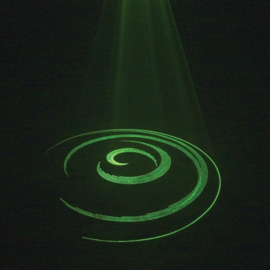 лазерная вращающаяся голова, зеленый лазер 30мВт, вращение 540/220град.,диммер, угол луча 13 град., ручной фокус, управление: активация встроенных программ звуком, DMX