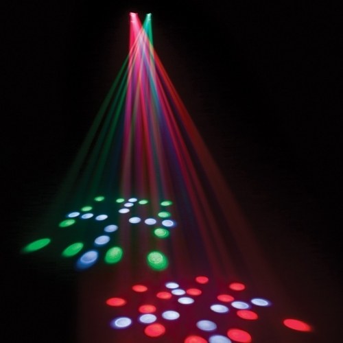 DMX-управляемый сканер с зеркалом, создающий эффект «лунного цветка» с красными, зелеными и синими лучами.