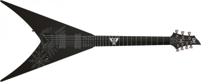 Электрогитара, 7 струн, V-тип, подписная модель Negral (Behemoth), корпус из красного дерева, сквозной гриф из клена с накладкой из черного дерева, инкрустация в виде орла на грифе, мензура 25,5", 24 XJ лада, бридж TonePros 7 / струны сквозь корпус, звукосниматели EMG 81-7 / 707, 1 громкость, 3-х позиционный переключатель, механика: черный никель, замковые колки, цвет: BLKS (Black Satin)