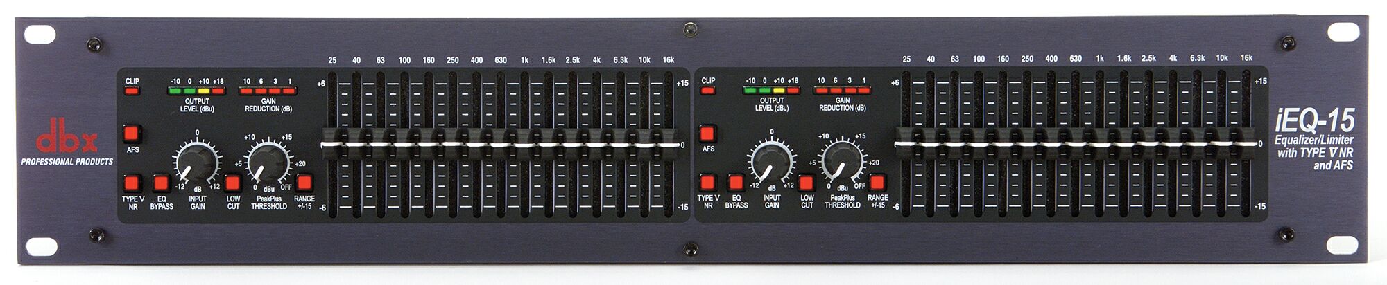 DBX IEQ15 - Двуканальный 2/3-октавный эквалайзер оборудован многополосной цифровой автоматической системой подавления акустической обратной связи AFS. Семейство эквалайзеров DBX серии iEQ, заменившей собой легендарную в прошлом серию 30 отличается также наличием наиболее эффективно показавших себя регулируемых патентованных лимитеров PeakStopPlus в каждом канале и новой системой шумоподавления Type V на основе динамического фильтра, существенно снижающей шумы даже при экстремальных положениях движков.