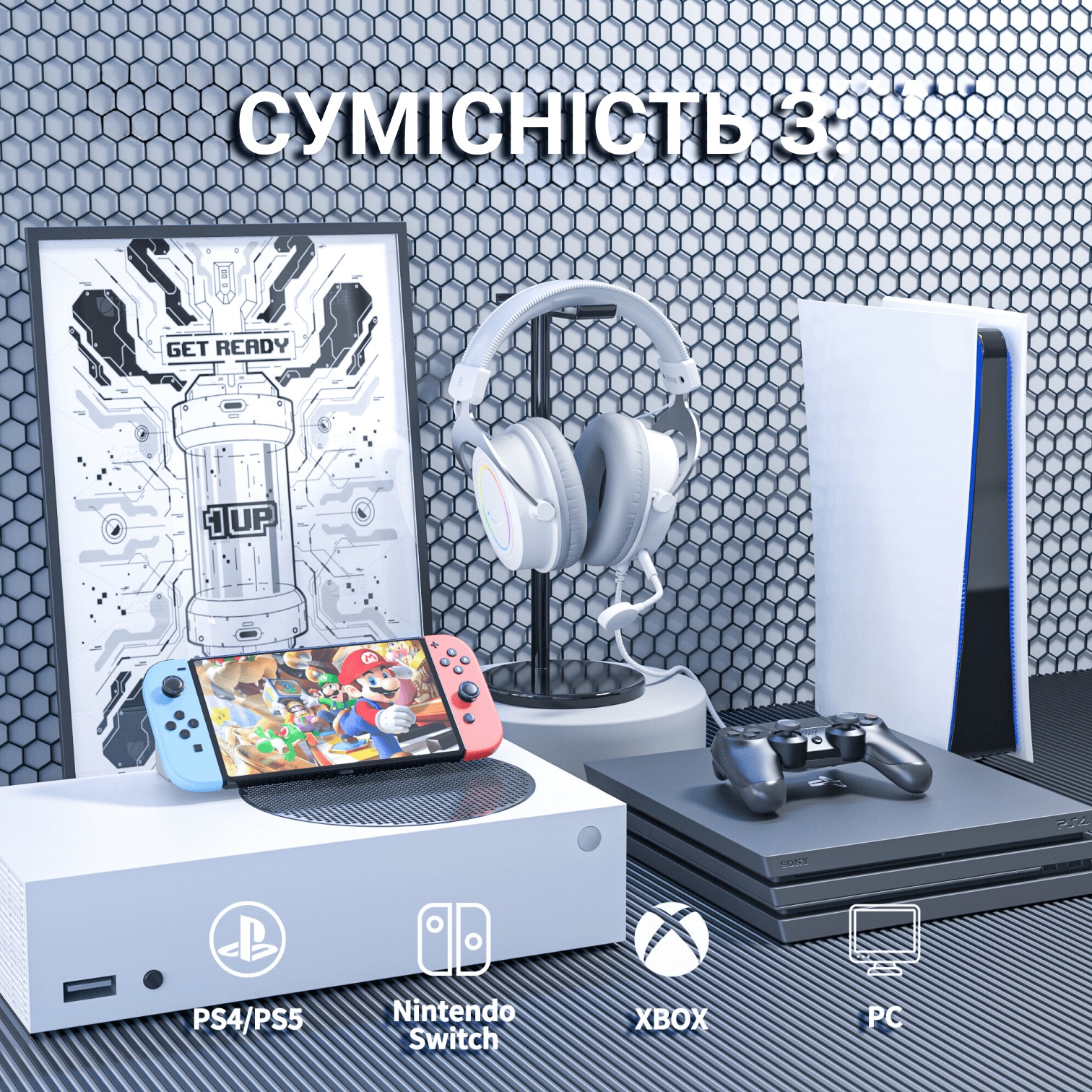Наслаждайтесь различными возможностями подключения благодаря 3,5-миллиметровому аудиоразъему проводной гарнитуры, что позволяет подключаться к широкому спектру игровых устройств и платформ. Среди них: Nintendo Switch, XBOX, геймпад PS4/PS5, смартфон, планшет, ПК.