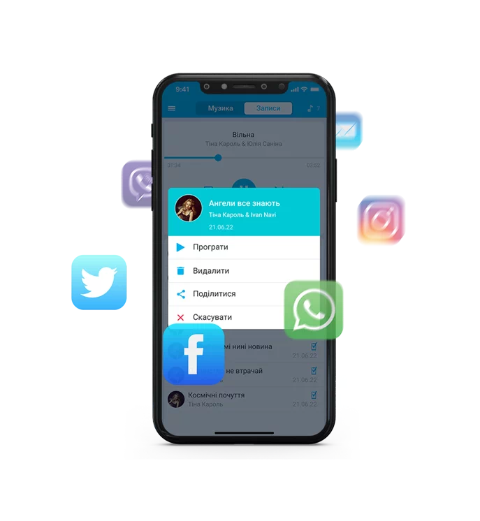 Записывайте своё исполнение в студийном качестве всего одним нажатием кнопки. Сохраненные записи можно скопировать на USB-носитель или моментально отправить друзьям и близким прямо с вашего смартфона.