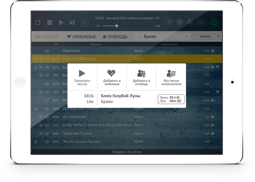 - Ведение очереди выступления исполнителей. Вы можете с легкостью добавлять композиции в очередь и при этом предварительно выставлять значение темпа и тональности под свое исполнение.