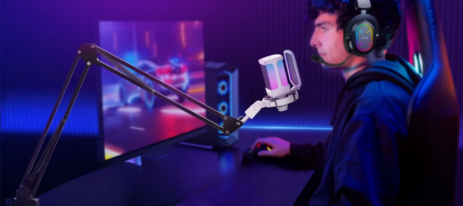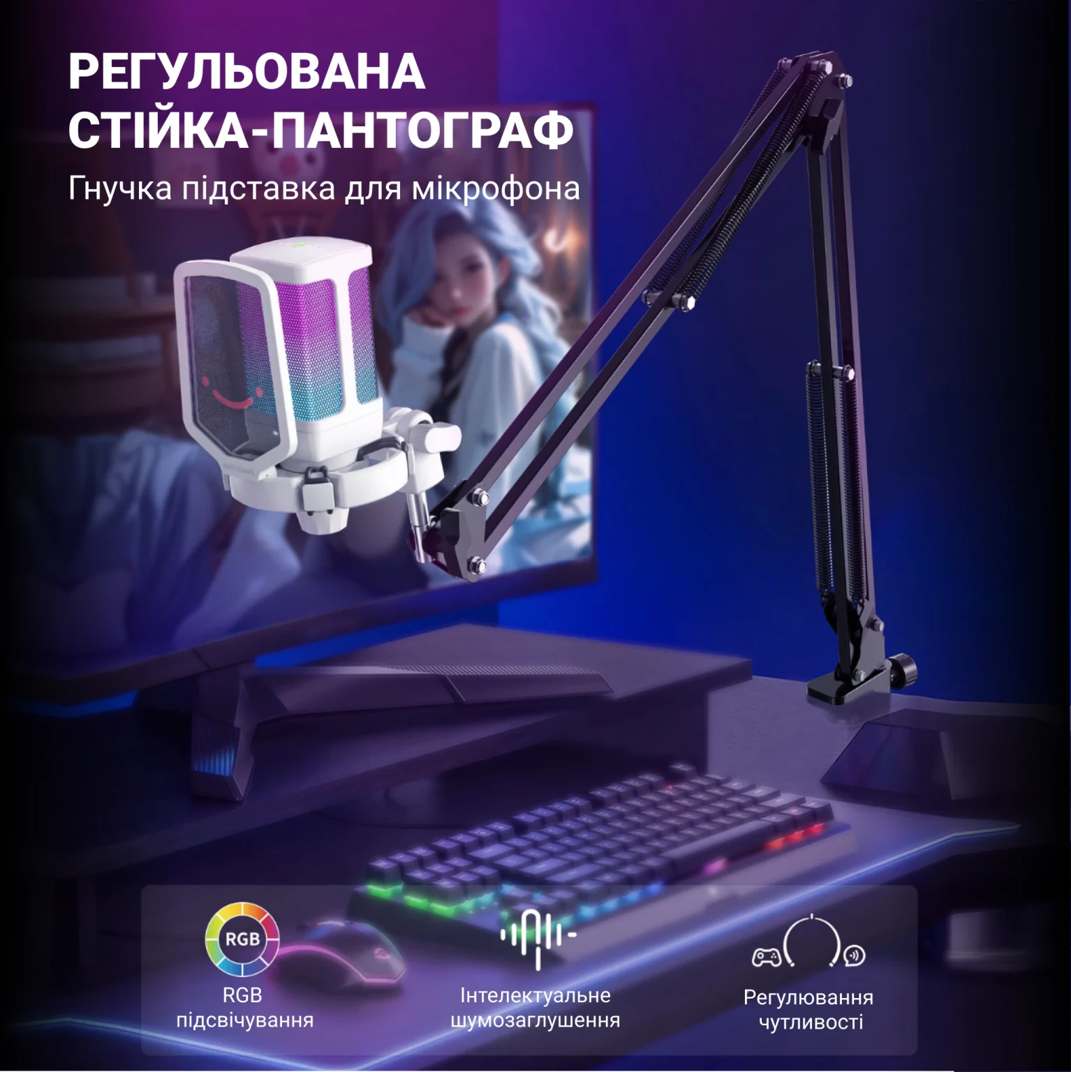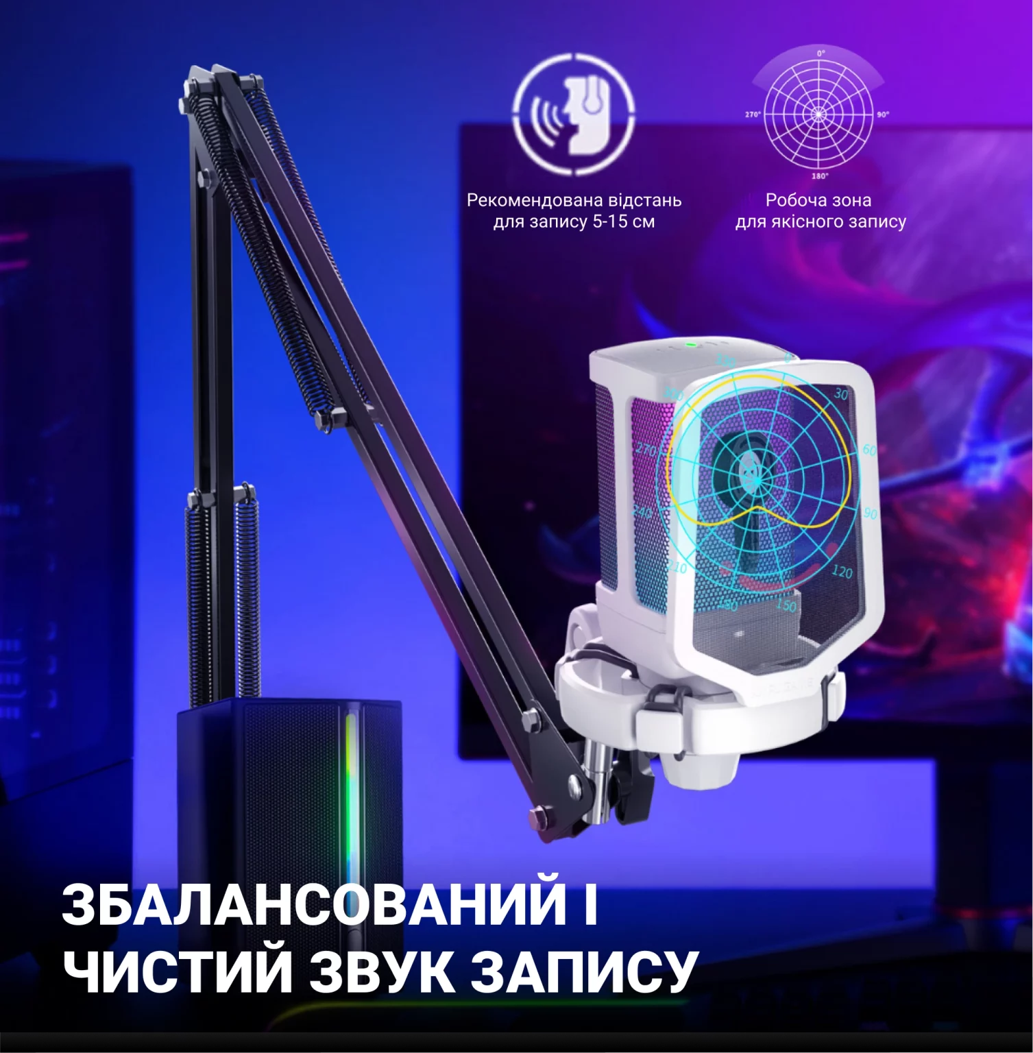 Прочный пантограф в комплекте позволяет регулировать горизонтальное и вертикальное положение микрофона, что обеспечивает идеальное расположение и эффективную организацию рабочего пространства. Регулируемая RGB-подсветка с разными режимами придает стилю и позволяет создать уникальную атмосферу, подчеркивая ваш профессионализм в любом творческом процессе. Микрофон совместим с Windows, Mac и PlayStation, а порт USB, расположенный за микрофоном, делает подключение простым и удобным.