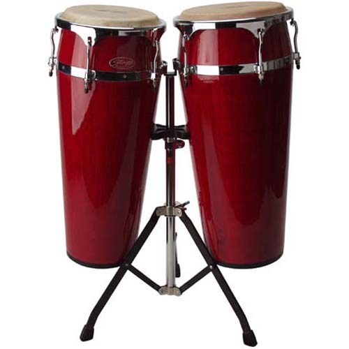 Двойные латинские барабаны, 10"/11", с регулируемой стойкой (80..100см), внешние обручи 12"/13", высота 74см, цвет: красный