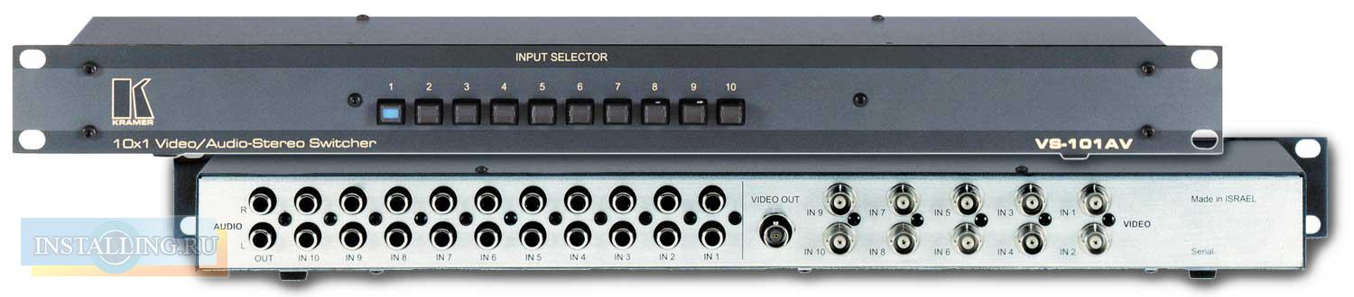 VS-101AV – механический коммутатор 10:1 для композитного видео и аудио стереосигналов. Применяется в тех случаях, когда для коммутации необходим модуль в настольном исполнении, не требующий сетевого электропитания. Сигнал аудио всегда коммутируется вместе с соответствующим сигналом видео, а неактивные видеовходы замкнуты на корпус через резистор 75 Ом. Высококачественные комплектующие, из которых выполнены коммутирующие элементы, обеспечивают надежную изоляцию входов.