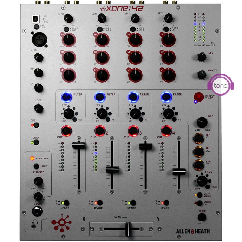 "Разработанный с учетом всех последних DJ технологий микшерный пульт Allen&Heath Xone:42 обладает эргономичной интуитивной структурой, что делает его одним из самых простых в эксплуатации высококлассных микшеров" - комментирует новость дизайнер линии Xone Энди Ригби Джонс. Одна из основных характеристик микшера Allen&Heath Xone 42 это 4 двойных стерео канала: каналы 1 и 4 phono/line и каналы 2 и 3 line/line. Все 4 канала имеют 3-х полосный эквалайзер (+6 дБ), 9-секционный 3-х цветный индикатор уровня сигнала, контроль чувствительности, 60 мм VCA-фейдеры и 45 мм VCA-кроссфейдер. Фильтр Xone регулируется на каждом канале при помощи подсвеченных переключателей с выбираемым режимом фильтра, резонансом и контролем частоты.