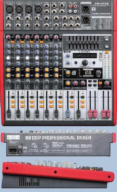 8-канальный микшерный пульт с цифровым дисплеем MP3 (U-DISK/SD CARD MP3 input) и USB-входом, Встроенный процессор цифровой обработки сигналов на 99 эффектов +48V фантомное питание 4 моно микрофонные/линейные входа 4 линейных стерео входа каждый канал с отключением звука с функцией подавления шума для караоке 3-х полосный эквалайзер на каждый канал Ползунковые фейдеры
