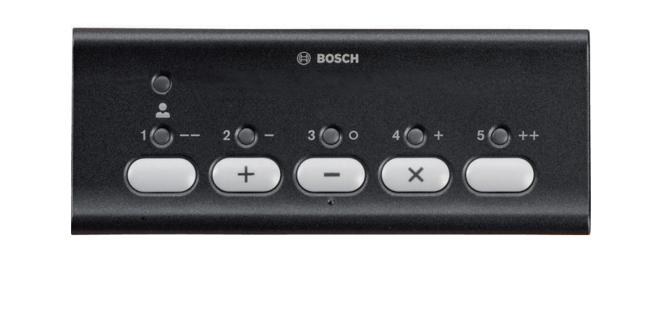 - Пять кнопок для голосования с желтыми индикаторными ободками для напоминания о необходимости зарегистрировать свое присутствие, начать голосование и подтвердить свой голос. Кнопки и индикаторы работают следующим образом: «Да» (+), «нет» (-) и «воздержался» (x) (используется для регистрации присутствия, парламентского голосования и голосования «За / против»); Цифры от 1 до 5 (используются при опросах с множественным выбором, опросах мнений и рейтинговых опросах); Рейтинговая шкала: - -, -, 0, +, ++ (используется при определении реакции аудитории).