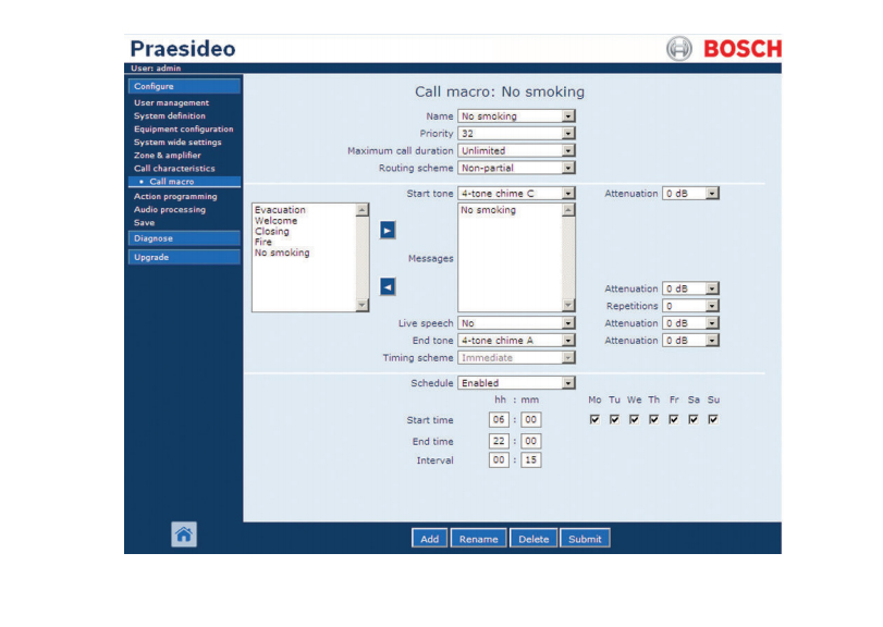 Макросы оповещений позволяют пользователям настраивать различные функции и/или действия, которые могут быть назначены входам, например, входам управления и клавишам станций передачи объявлений. Один и тот же макрос оповещений может быть назначен нескольким входам. Макрос оповещений определяет: приоритет, начальный и конечный звуковой сигнал, сообщение или последовательность сообщений, количество повторений, а также их продолжительность и интервал между ними.