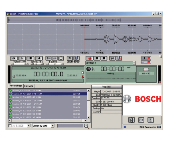 Модуль «Запись заседания» может использоваться в сочетании с системами CCS 900, DCN Next Generation или беспроводной конгресс-системой DCN Wireless. DCN‑MR предназначен для записи и воспроизведения хода заседания или конференции. Запись выполняется на жесткий диск компьютера в формате PCM/WAV, WMA или MP3.