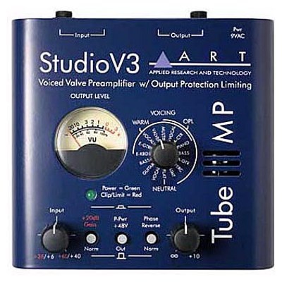 Микрофонный предусилитель Tube MP Studio V3 использует технологию V3(Variable Valve Voicing), которая предлагает 16 пресетов, оптимизированных для работы с различными источниками сигнала (вокал, гитара, бас-гитара). Есть настройки для получения неокрашенного звучания и настройки, включающие в себя комбинацию лампового утепления и лимитера. Устройство имеет стрелочный индикатор и ручку выбора пресета.