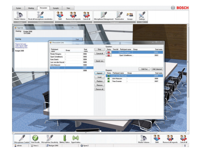 Оператор подготавливает ход обсуждения при помощи конфигурационного приложения. Параметры микрофонов могут быть заданы для каждого пункта повестки дня. Имеются следующие параметры: режим работы микрофона, количество активных микрофонов, список записавшихся на выступление, индивидуальные и групповые таймеры и другие. Во время совещания у оператора есть возможность выбрать заранее установленные параметры или вносить изменения в реальном времени.