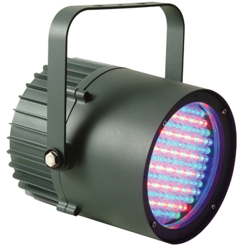 Профессиональный, для наружного применения (IP65), 145 светодиодов RGB, угол луча 45 градусов, 4 DMX режима, 1..4 DMX каналов, активация звуком, диммер, литой алюминиевый корпус, черный
