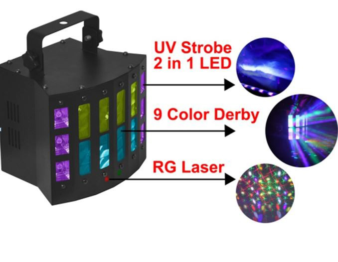 - Особенности: 4в1 дерби эффект, лазер, ультрафиолет и стробоскоп