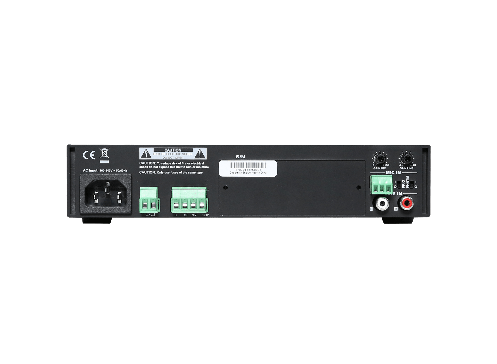 Усилитель разработан с использованием технологии усилителя класса D и обеспечивает выходную мощность 80 Вт для аудиосистем с постоянным напряжением (100 В и 70 В) или с низким импедансом (4 Ом). Импульсный источник питания обеспечивает совместимость с широким диапазоном сетевого напряжения для глобальной совместимости.