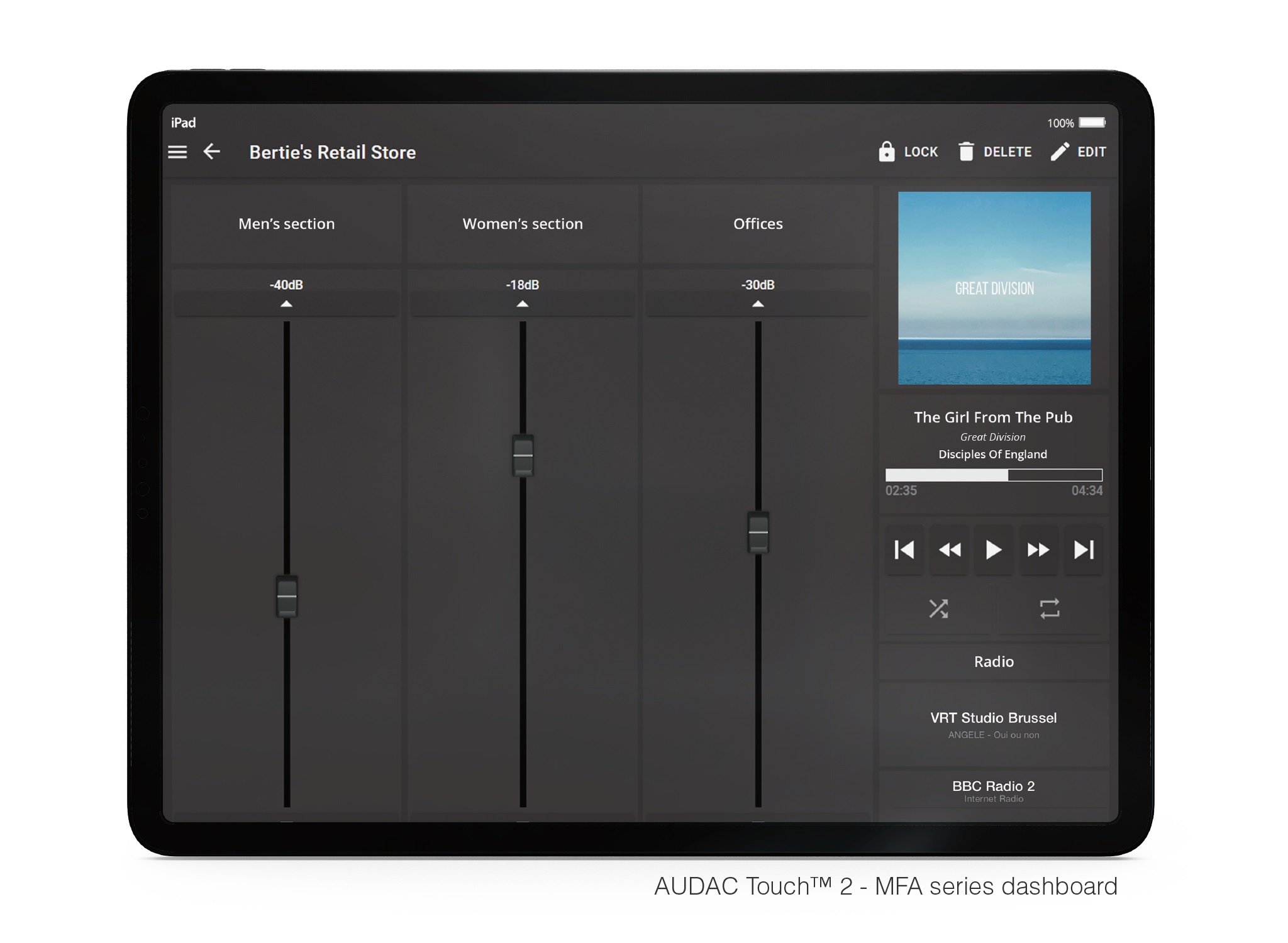 Серия MFA управляется как RS232, RS485, так и TCP/IP, что позволяет использовать их с системами домашней и промышленной автоматизации и периферийными устройствами. Используя бесплатно доступное приложение AUDAC Touch™ 2, управление и настройку можно выполнять с любого портативного устройства в любом месте и в любое время.