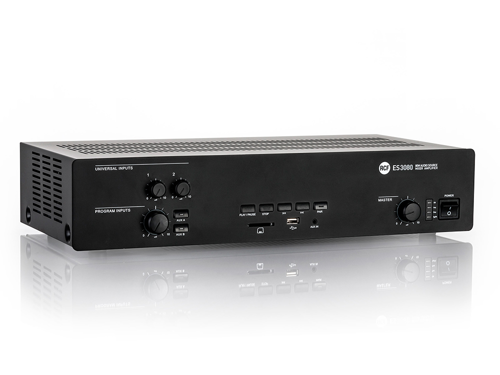 Ассортимент продукции итальянской компании RCF пополнился новой моделью ES 3080. Она представляет собой инсталляционный микшер-усилитель с двумя универсальными входами и дополнительным AUX-входом, оснащённый встроенным MP3-плеером и адаптером Bluetooth. Использоваться данная модель может в барах, ресторанах, торговых центрах, отелях, офисных зданиях и не только.