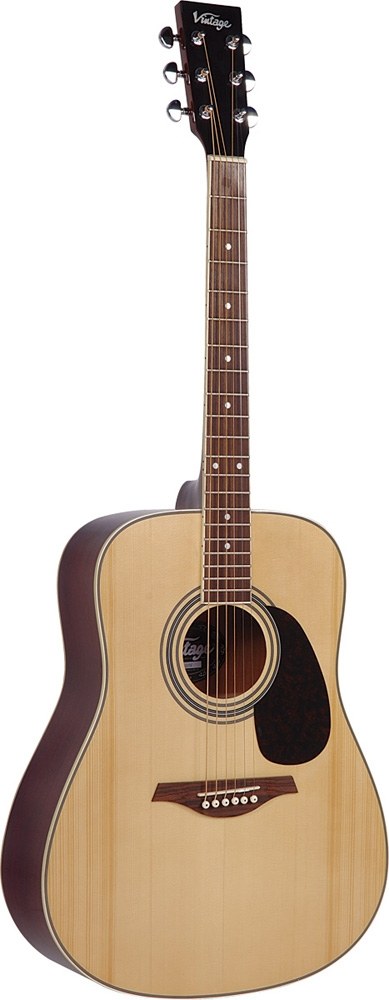 VINTAGE V-400N Акустична вестерн гітара, 21 лад Верхня дека: цільна ялина Нижня дека і обичайки: дерево нато Гриф: дерево нато з палісандровою накладкою Бридж: палісандр Хромированная механіка Колір: натуральний