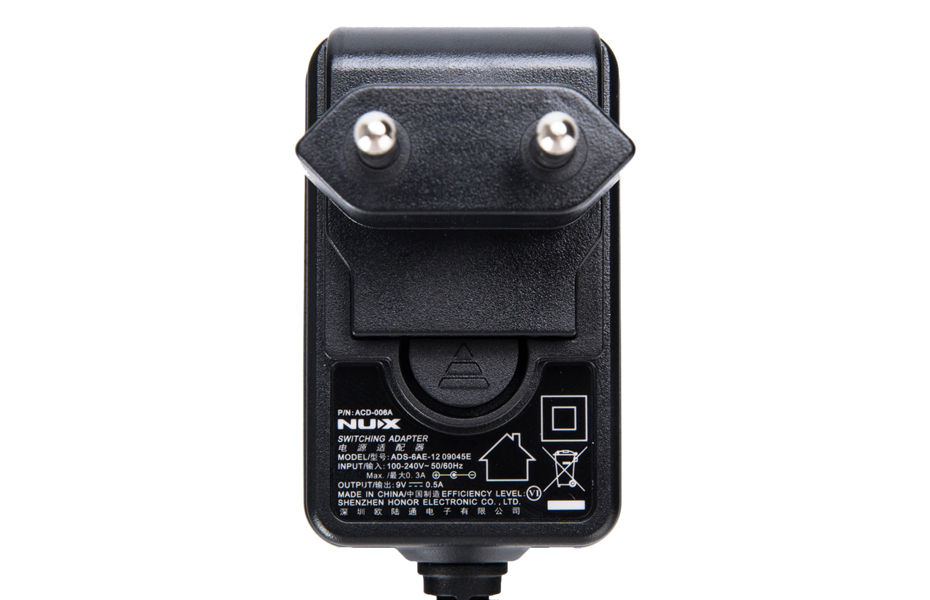 NUX ACD-006A це блок живлення імпульсного типу зі шнуром довжиною 150 см для гітарних педалей та процесорів з напругою 9 В. Цей пристрій дає постійний струм силою 500 мА. Робоча напруга блоку - 100-240 В. Це дає можливість використовувати його в країнах, де напруга може бути меншою за 220 В.