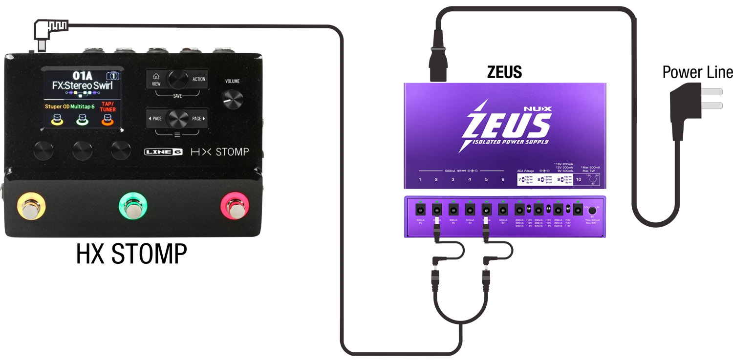 Крім звичайних кабелів постійного струму, кабелю зворотної полярності та кабелю з міні-штекером 3,5 мм, Zeus пропонує адаптер подвоювача струму HX. Зевс, безперечно, може керувати навіть LINE6 HX-STOMP.