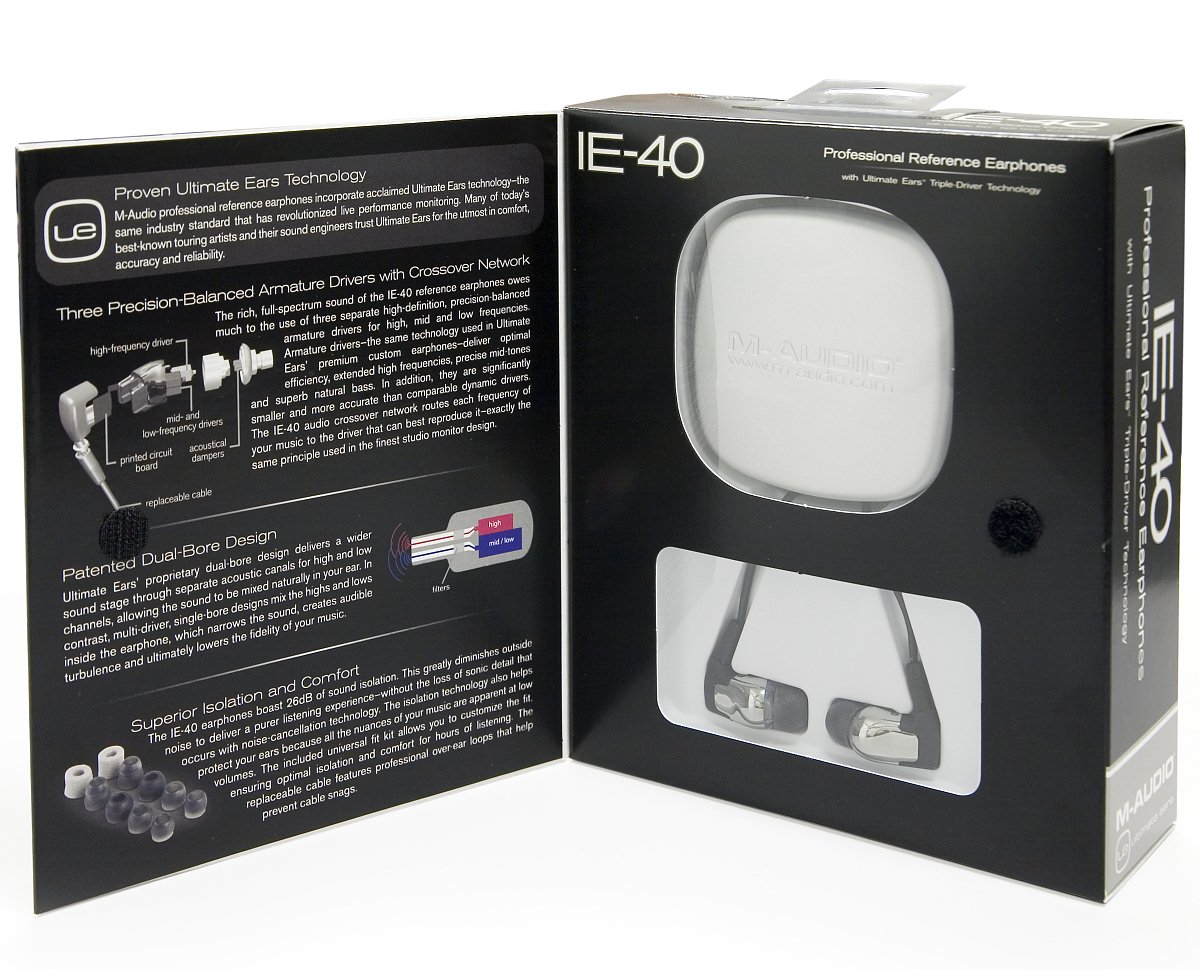 Розроблені з використанням запатентованої технології Ultimate Ears референсні навушники M-Audio IE-40 дозволяють виробляти високоточний моніторинг, де б ви не знаходилися. Навушники IE-40 з трьома драйверами, трьома короссоверамі, двома повітроводами і технологією Ultimate Ears є чудовим рішенням, відповідним для всіх вух.