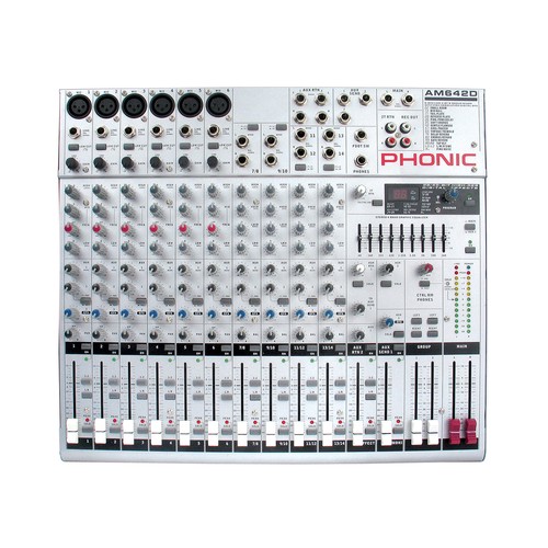 PHONIC AM 642D - мкшерний пульт, 6 мікрофонних входів, 4 стерео входу, 2 підгрупи, 3 смуговий EQ , процесор ефектів -100 еф., доп. входи / виходи RCA.