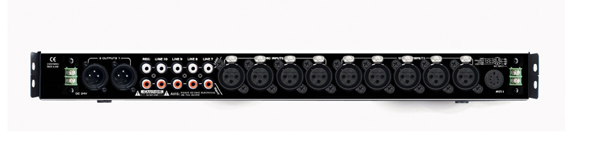 - Входи: 9х Line (Cinch / XLR) + 9х Mic (XLR) + 1x PTT (7-контактний роз'єм Din).