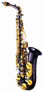 Саксофон альт Eb, нікельований чорний корпус, покриття клапанів - золотий лак, високий F # і передній F клапани, з пластиковим кейсом.