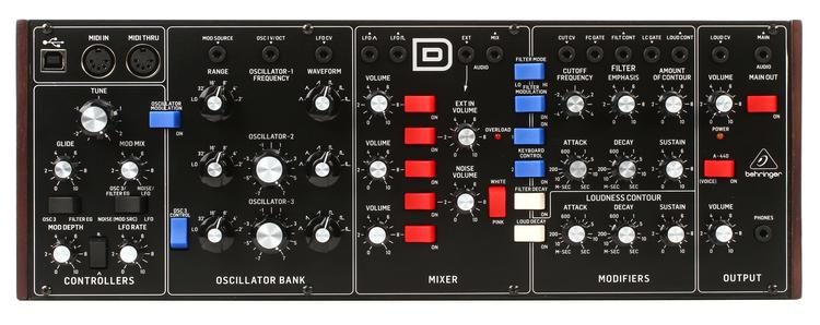 Якщо говорити простою мовою, то Behringer D виглядає отпадно! Дерев'яні торцеві панелі, Eurorack розмір, який дуже зручно тримати також і в руках, ручки з фіксованими значеннями і перемикачі, все це дуже доставляє при використанні. Три осцилятора, керовані напругою, встановлюють приголомшливу звукову вогневу міць, в той час як класичний набір управління забезпечує величезну кількість налаштувань в режимі реального часу. Існує також зв'язок з CV для полумодальной гнучкості і взаємодії із застарілим обладнанням. Behringer зібрав все необхідне (а трохи більше) в цю маленьку перлину синтезу. З Behringer Model D так і хочеться взяти і почати створювати музику!