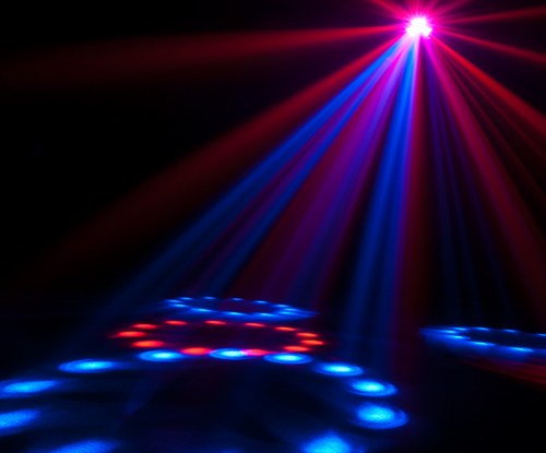 Багатоколірний світловий ефект Fallout ™ створює безліч обертових променів. Цей унікальний прилад утворює кільця червоного, зеленого і синього кольору. Управління обертанням двигуна і світінням світлодіодів дозволяє добится потрібного Вам ефекту і змінювати його в залежності від поставленого завдання.