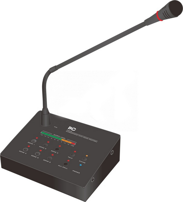 Дистанційна мікрофонна консоль ITC T-216 працює з 6-зонним микшируючі підсилювачами TI-1206S, TI-2406S, TI-3506S, TI-5006S. Використовується для вибору зон, передачі мовних повідомлень оператором, передачі сигналу привернення уваги ( «ГОНГ») і запуску сирени.