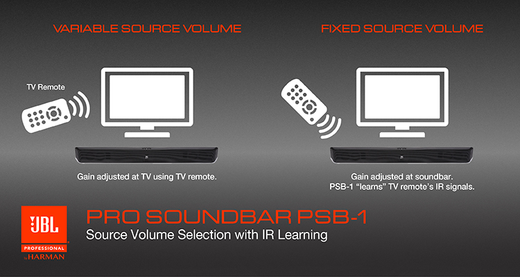 JBL ProSoundbar може працювати з різними джерелами, які мають як постійну, так і регульовану гучність. У першому випадку гучність регулюється на саундбаре з підтримкою штатного пульта ДУ від джерела, у другому - задається самим телевізором. Для того, щоб звук акустичної системи не заважав сусідам (наприклад, при недостатній звукоізоляції окремих номерів в готелі), передбачений спеціальний 4-позиційний обмежувач потужності, який дозволяє інсталятору при установці і настройці задавати максимально можливий рівень гучності. Для зручності установки в комплект входить антивібраційне настінне кріплення.