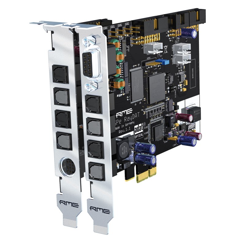 HDSPe RayDAT состоит из двух плат: основной (для шины PCIe) и дочерней (слота не занимает). На основной плате есть два восьмиканальных оптических цифровых интерфейса формата ADAT, девятиконтактный разъем D-Sub для прилагаемого кабельного адаптера с двухканальными электрическими цифровыми интерфейсами формата AES/EBU (XLR) и SPDIF (RCA).